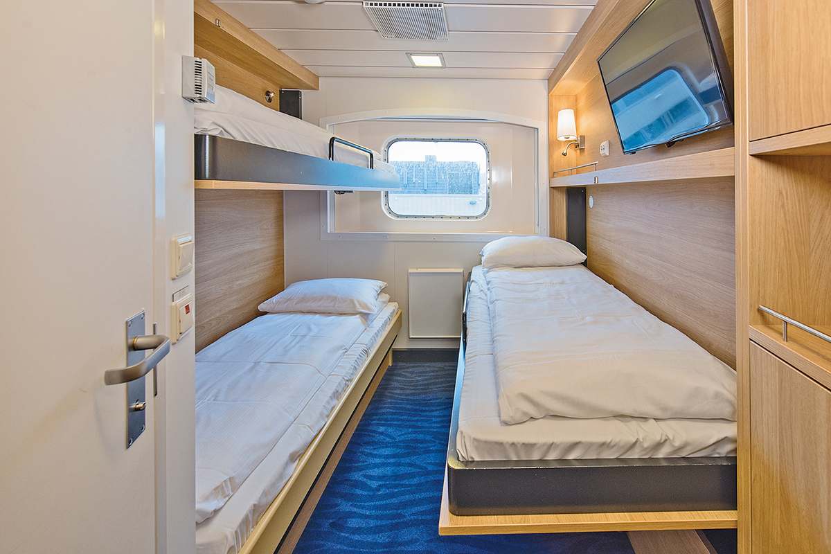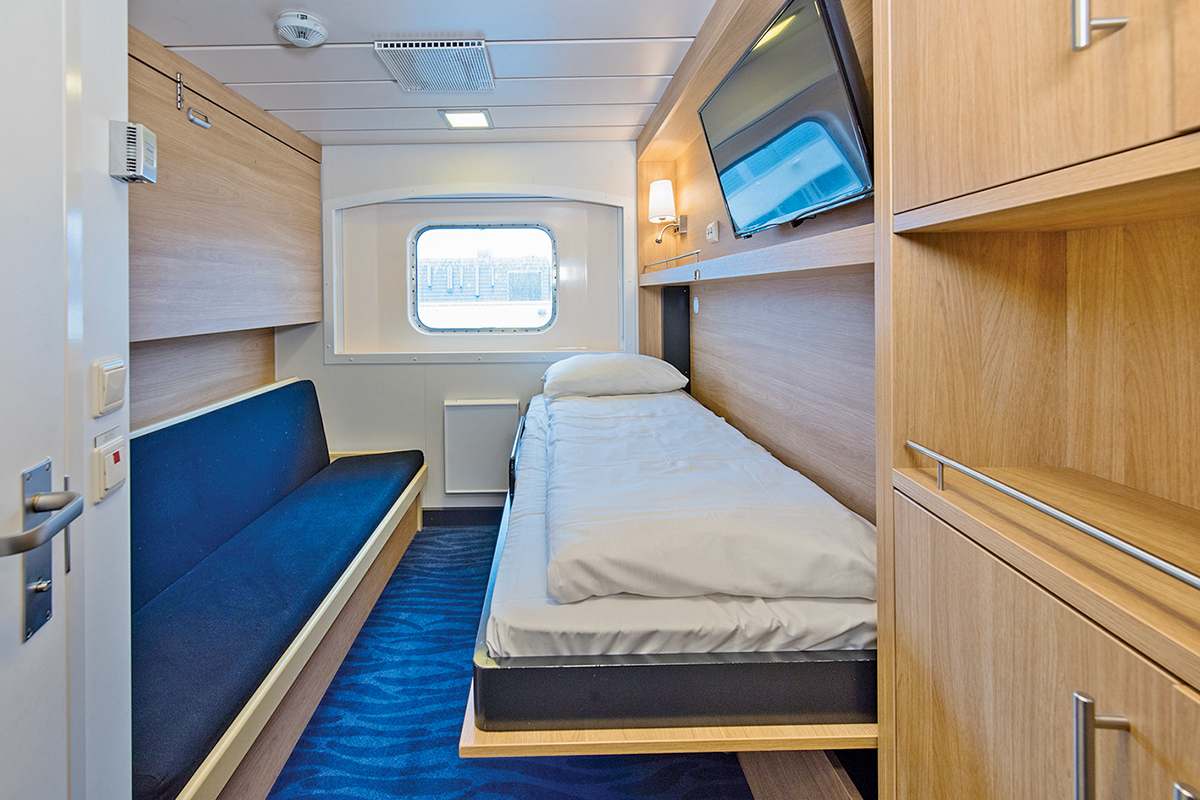 <7〜11㎡/シャワーのみ/角窓(開閉不可)/シングルベッド+ソファベッドとなります。ベッドは壁に収納可能です。>※窓の外は、お客様が通行することがあるプロムナードデッキとなる場合があります。また、一部視界が遮られるお部屋となる場合があります。